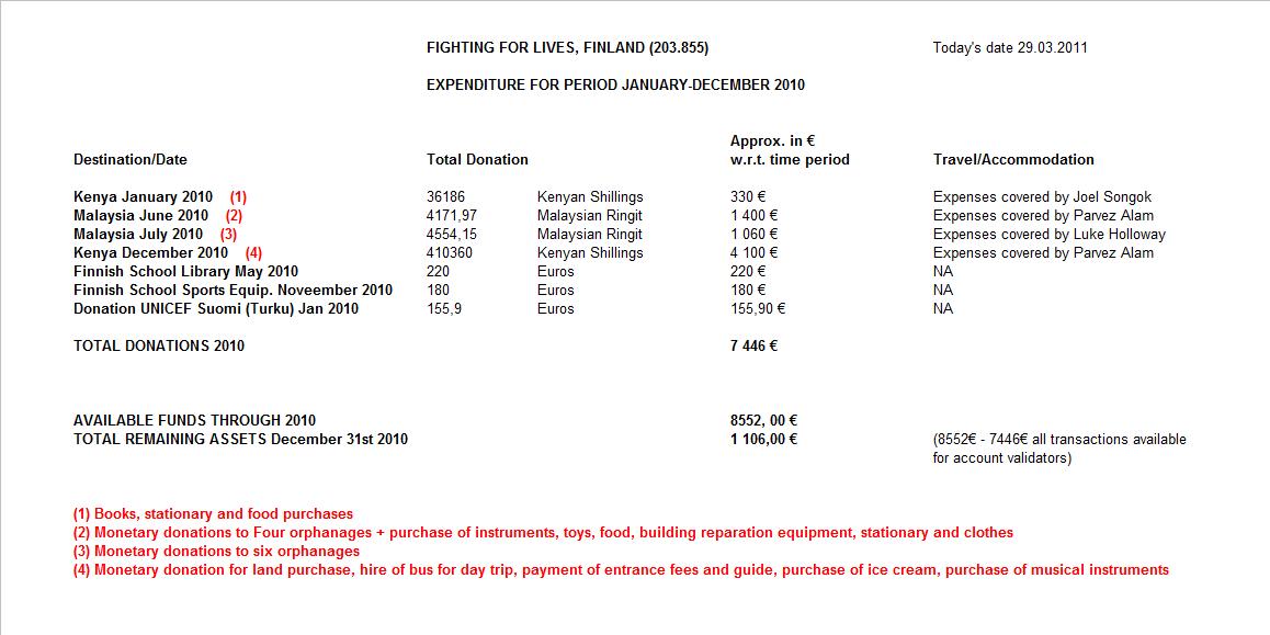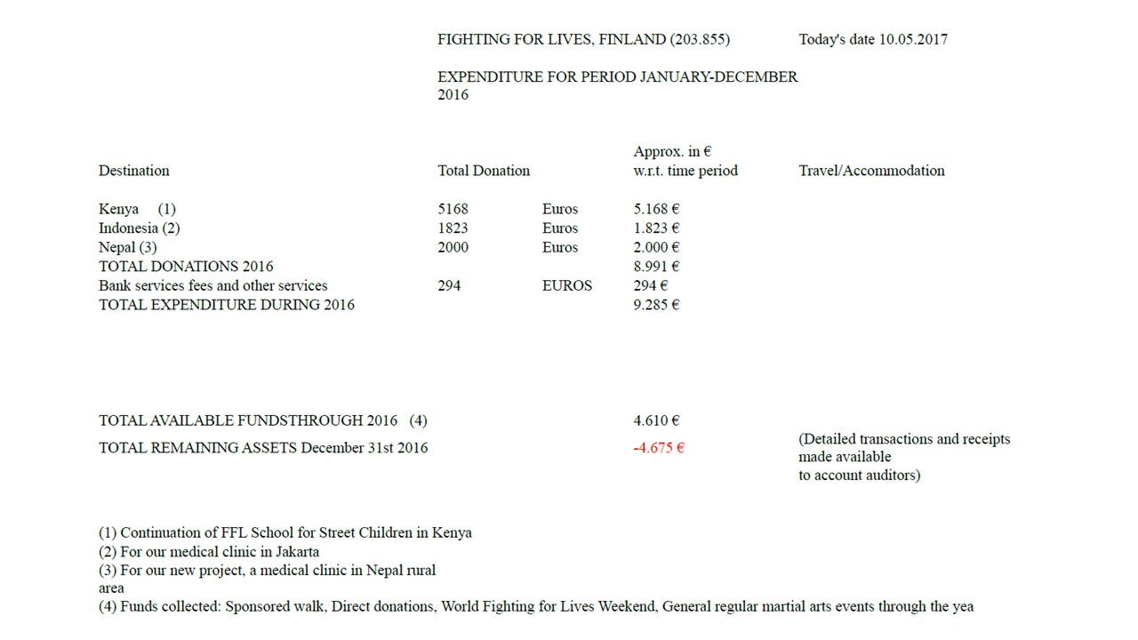 | TOTAL AVAILABLE FUNDS | Funds collected: Direct donations, Punk concert, World Fighting for Lives Weekend, General regular martial arts events through the year |