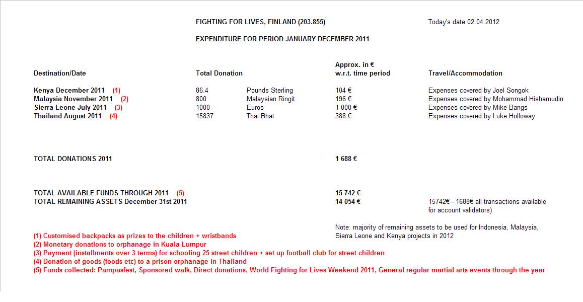 | TOTAL AVAILABLE FUNDS | Funds collected: Direct donations, Punk concert, World Fighting for Lives Weekend, General regular martial arts events through the year |